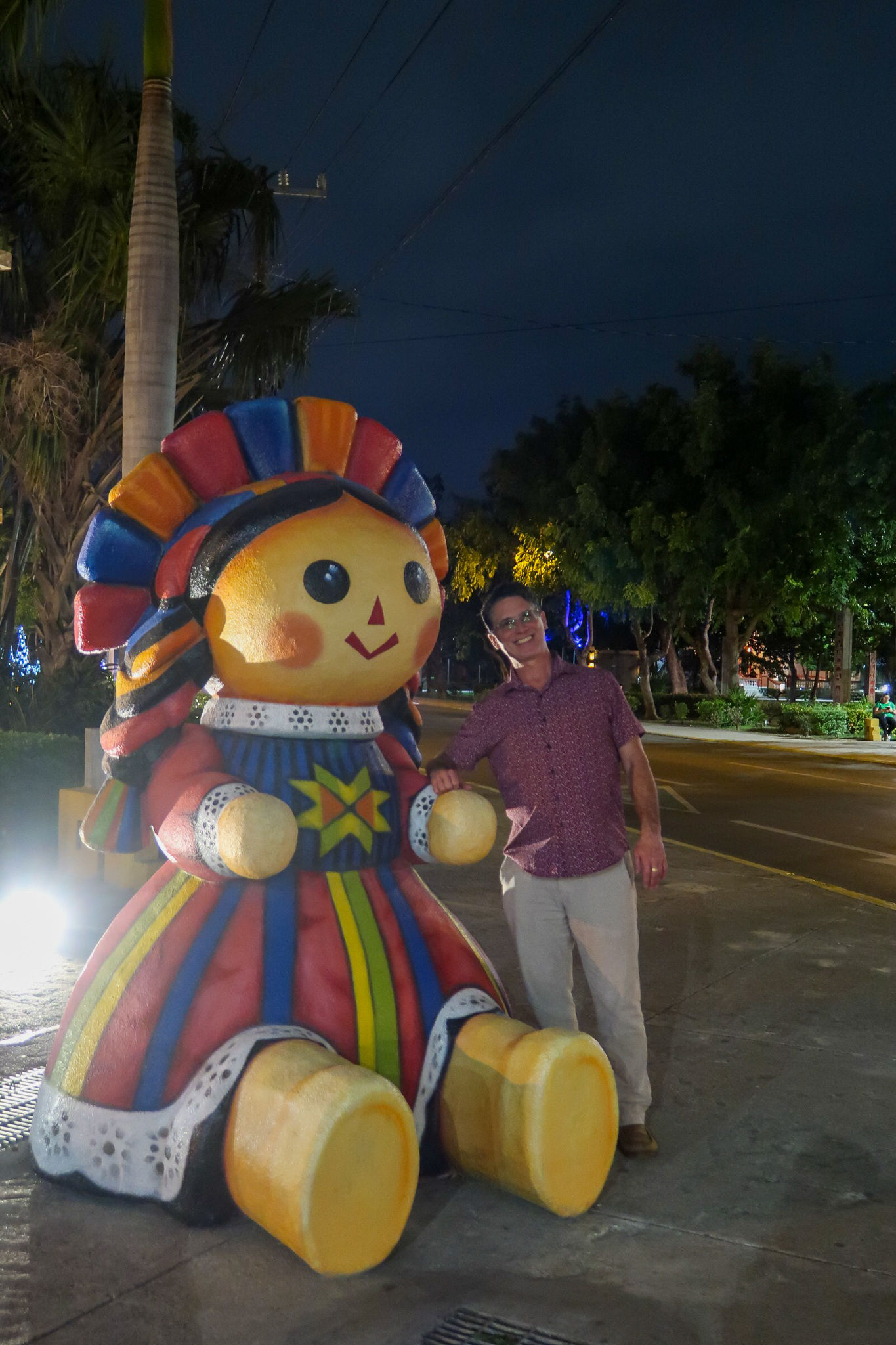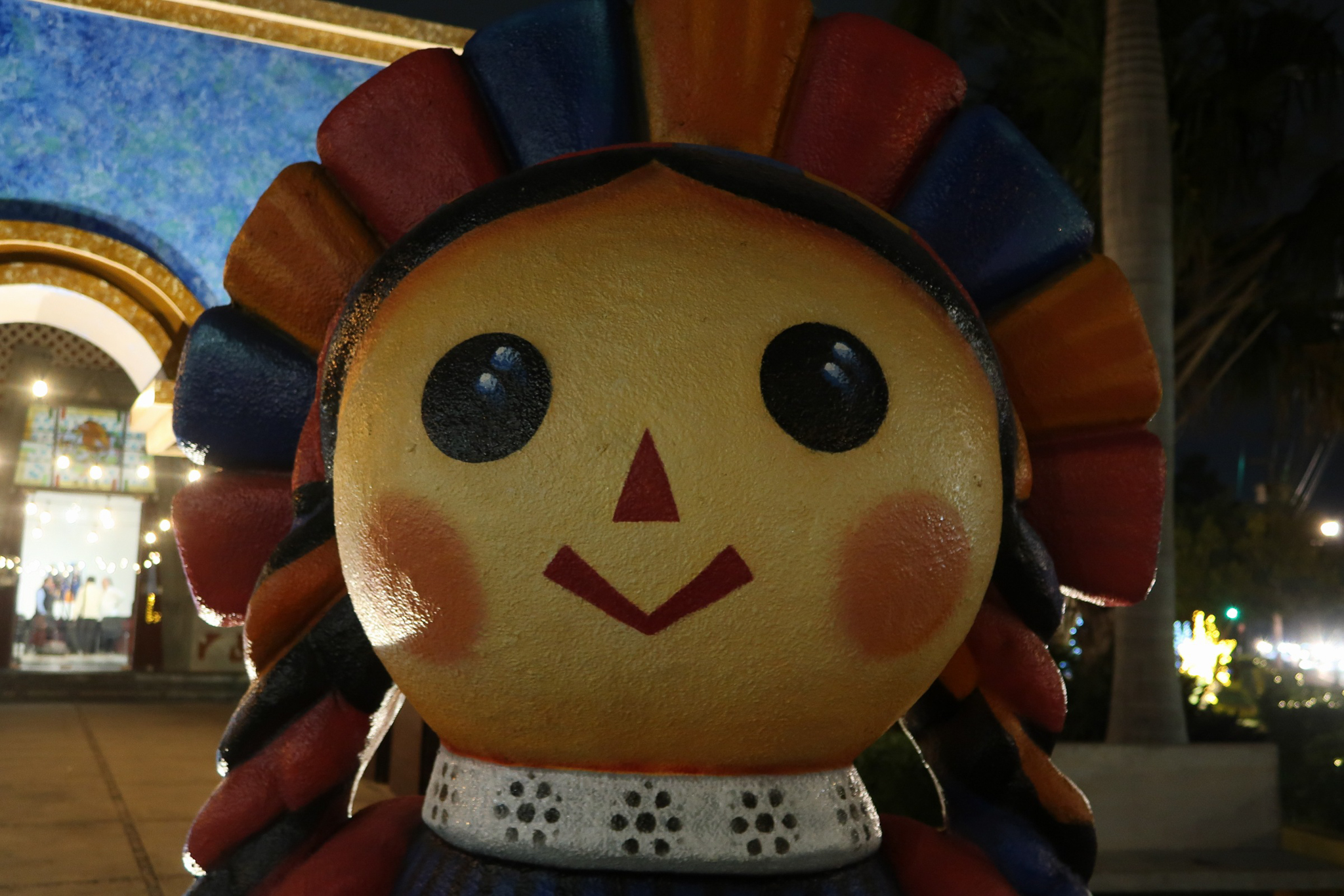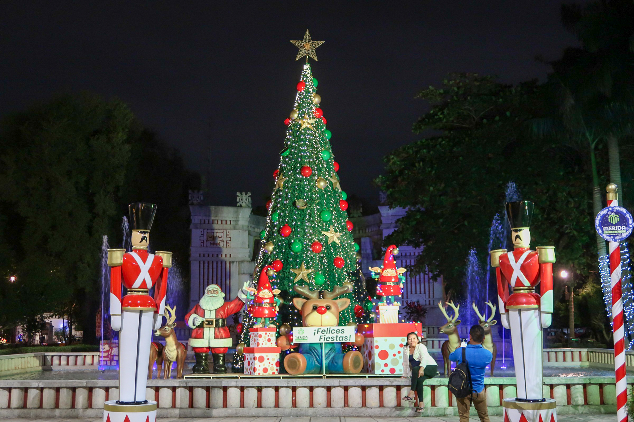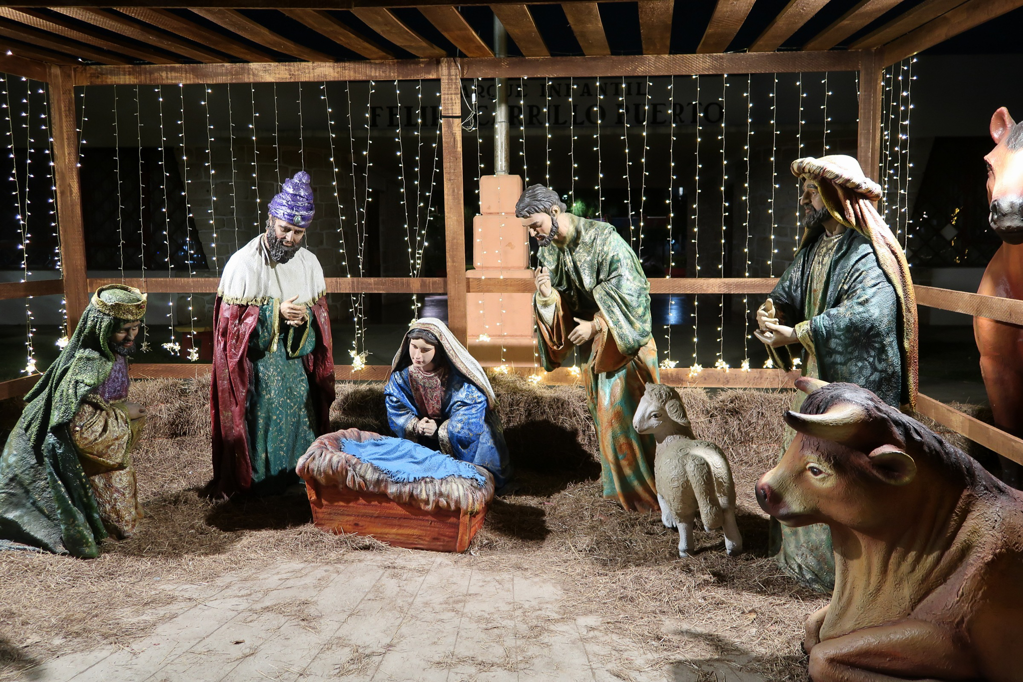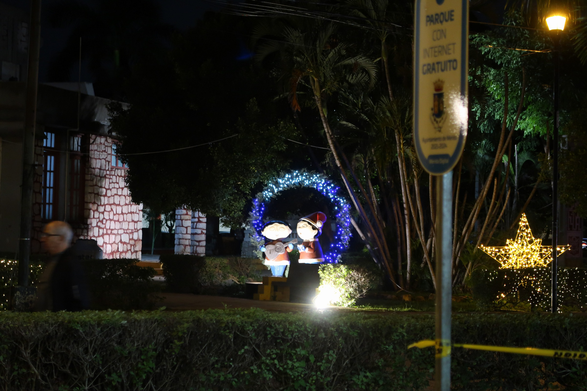 Seeing Christmas decorations in Merida has been both strange and joyful. There is something strange about seeing cold climate stalwarts such as Santa, snowmen and reindeer taking prominence in a tropical climate. The lights at night are beautiful and families take advantage of the pleasant evening temperatures and enjoy the festive atmosphere in the parks. Here in Mexico, Jesus is the reason for the season and it goes beyond Christmas Day and into the Epiphany, Dias de los Reyes. We wandered around last night and took some shots of the colorful lights and nativity display. Jesus seemed to be missing from the manger.