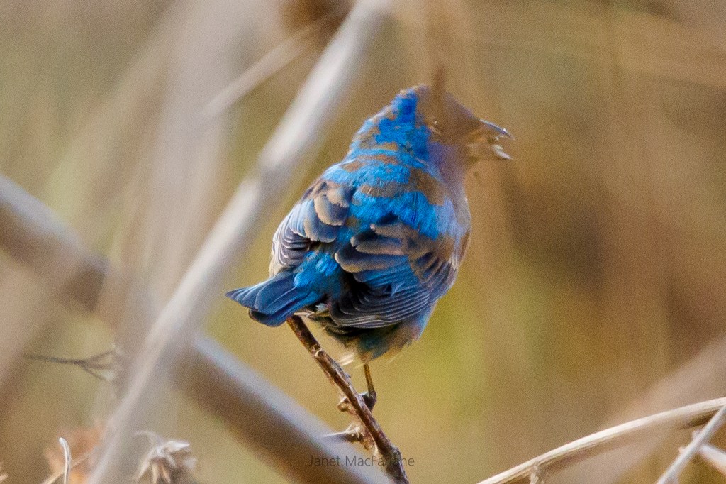 Not the best shot, but it is a bird that I usually only see during spring migration in Michigan. The Indigo Bunting is a seed eater and here he is, eating seeds.