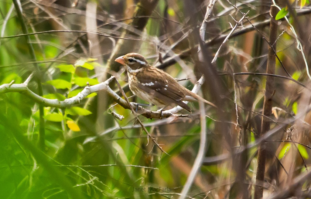 Now I know where The Rose Breasted Grosbeaks hang out during the winter! I spied a female Rose Breasted Grosbeak in the underbrush. I didn’t spot her male counterpart.