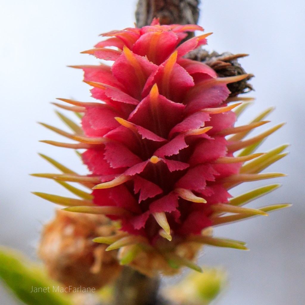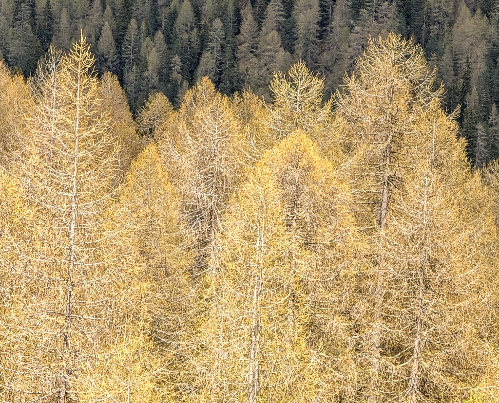 As we continued down, more trees and species appeared. The European Larch, a deciduous conifer, was giving off a subtle yellow glow from its fresh new leaves which were just sprouting. I am a fan of Larches. These deciduous conifers are lovely to see as they transition from winter to spring and fall to winter. Back in Michigan, in the fall, they glow a golden yellow in the late afternoon sun. I got to see the European larch in the Dolomiti and even got to nibble on one of its first emergent fruits. As we travelled down the mountain, we could see the new leaves just forming. A soft yellow glow appeared as the light hit the trees just right.