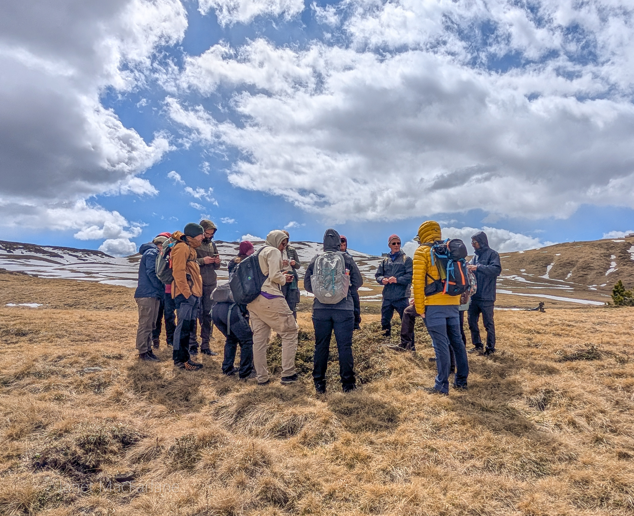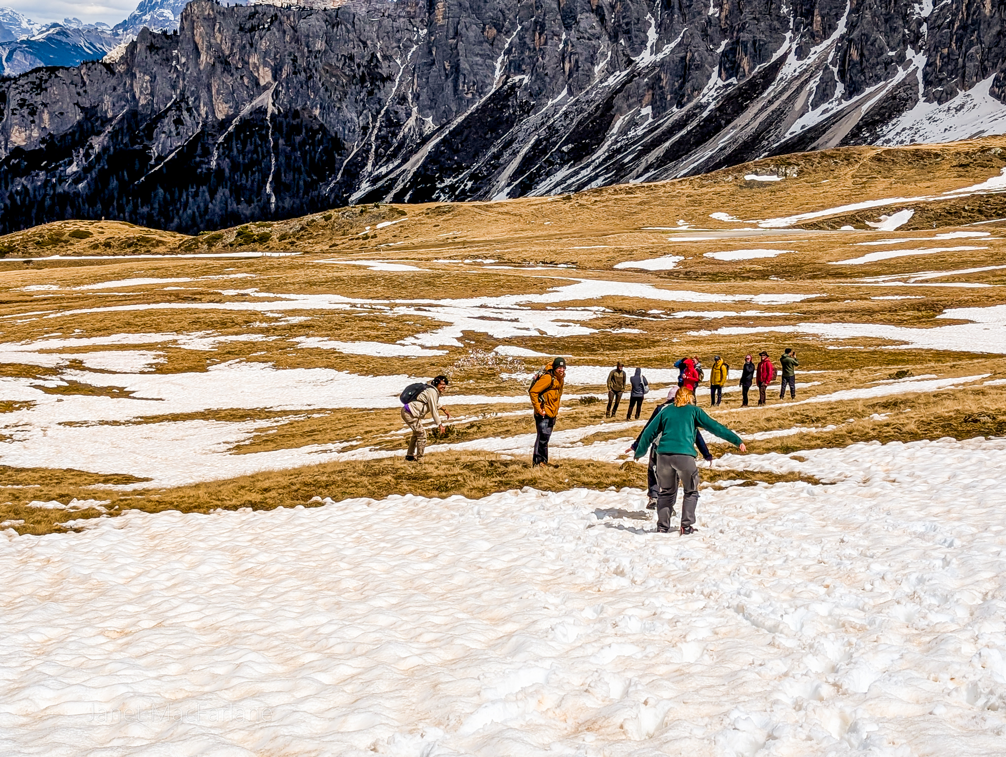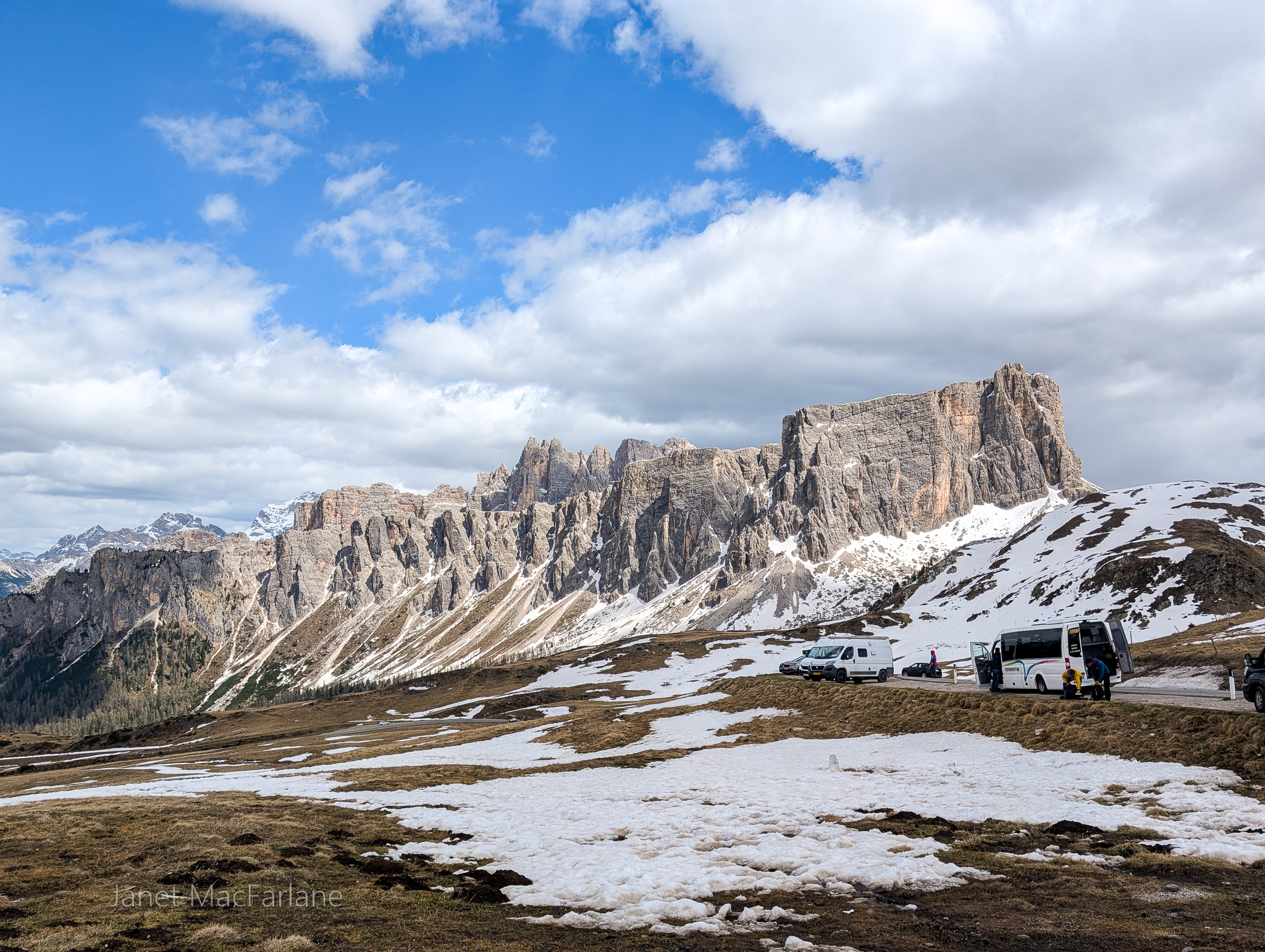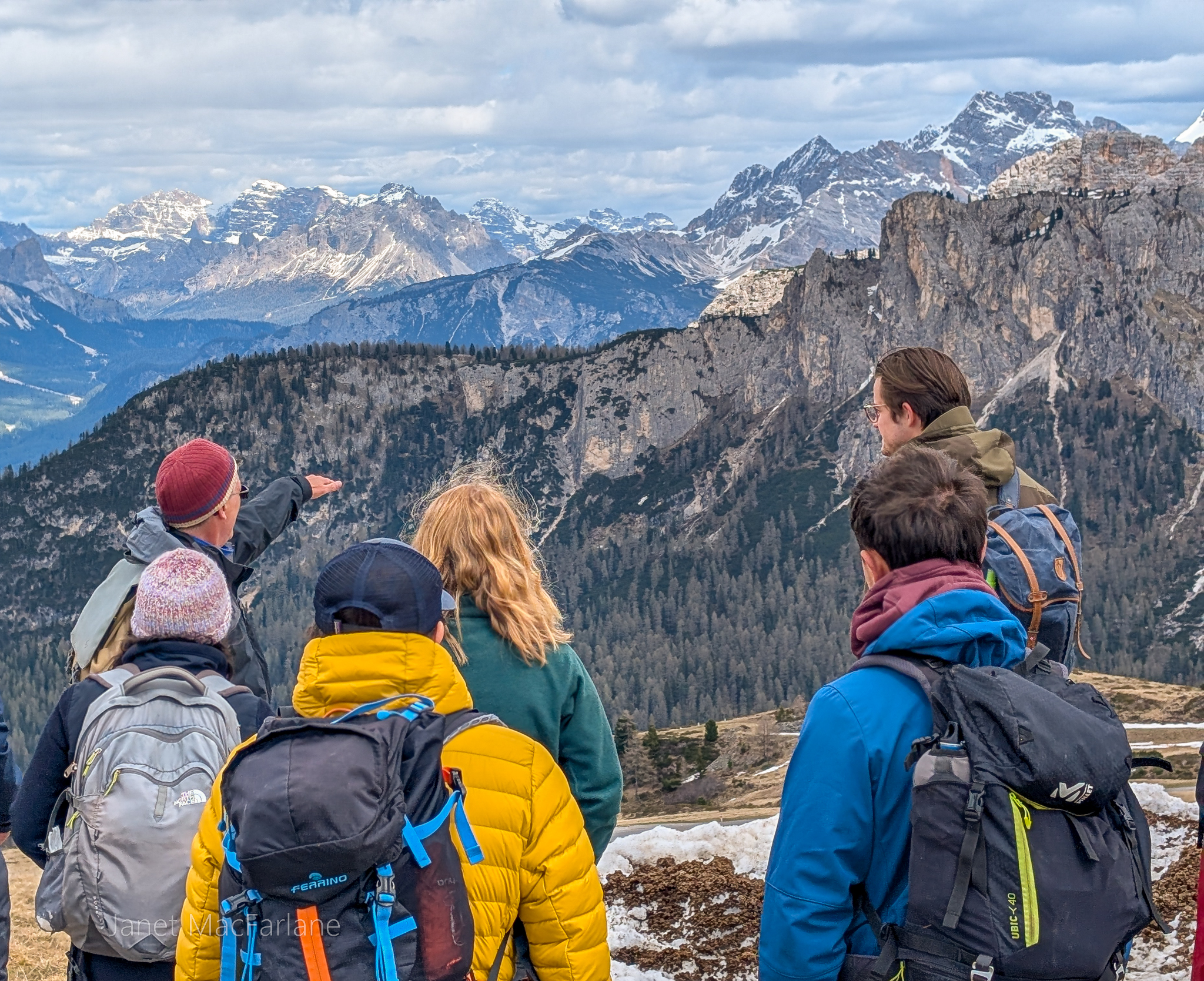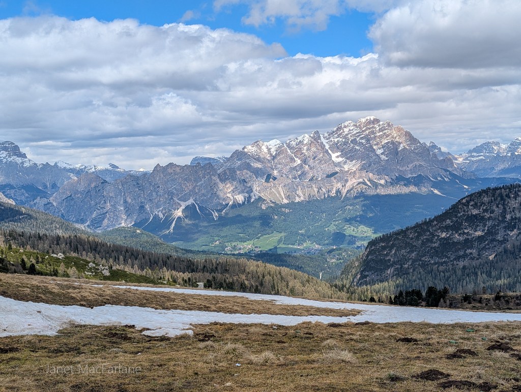 We boarded the bus again and travelled to another part of the mountains. We took a road winding up to the Passo Giau. The change in temperature was significant. It was cold and blustery. There was a little restaurant at our stop, but we had all packed lunches and ate them outside. After, we all went in for a hot beverage to warm ourselves before the next portion of the lesson.