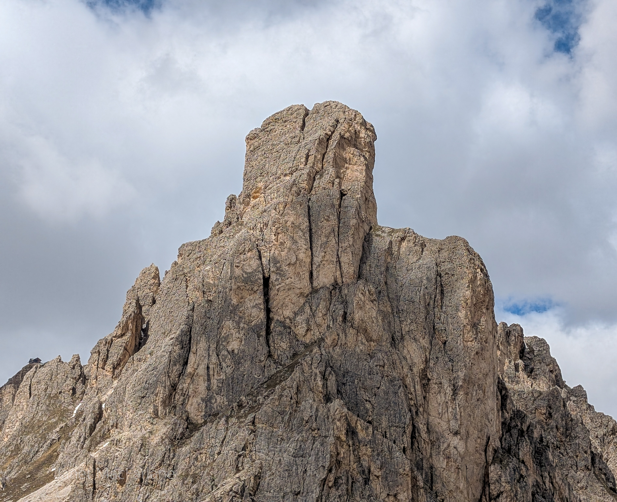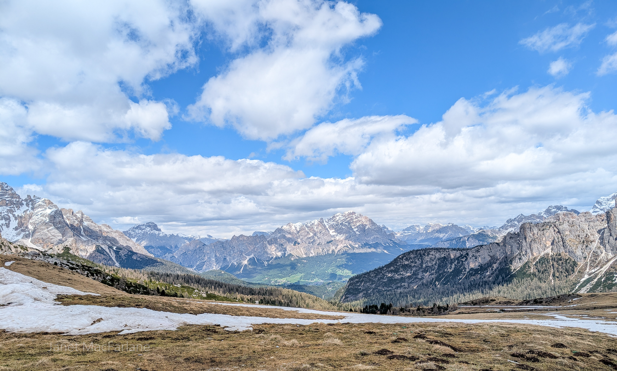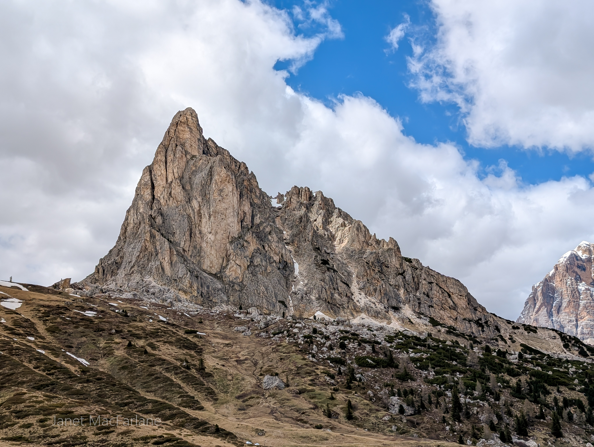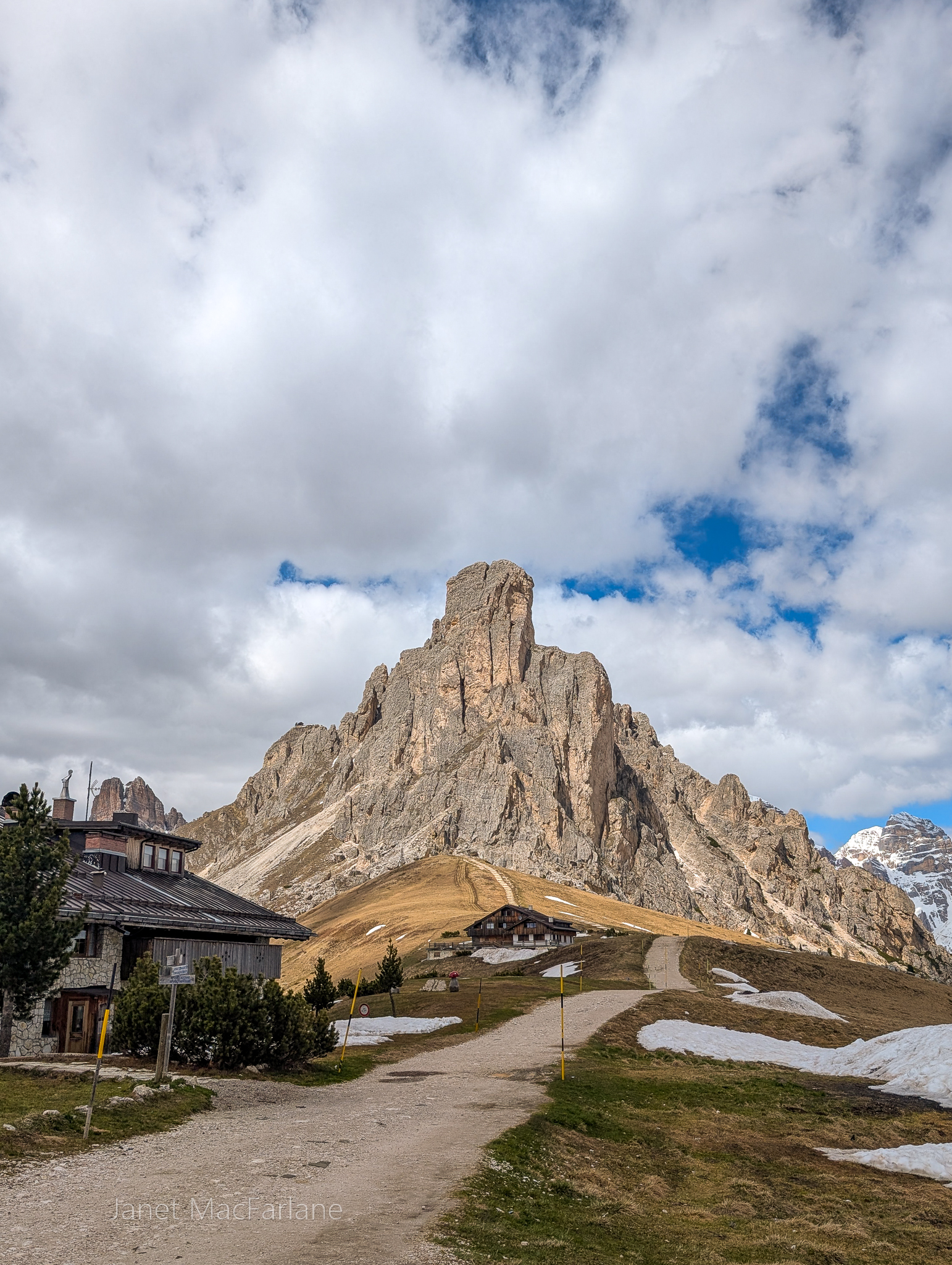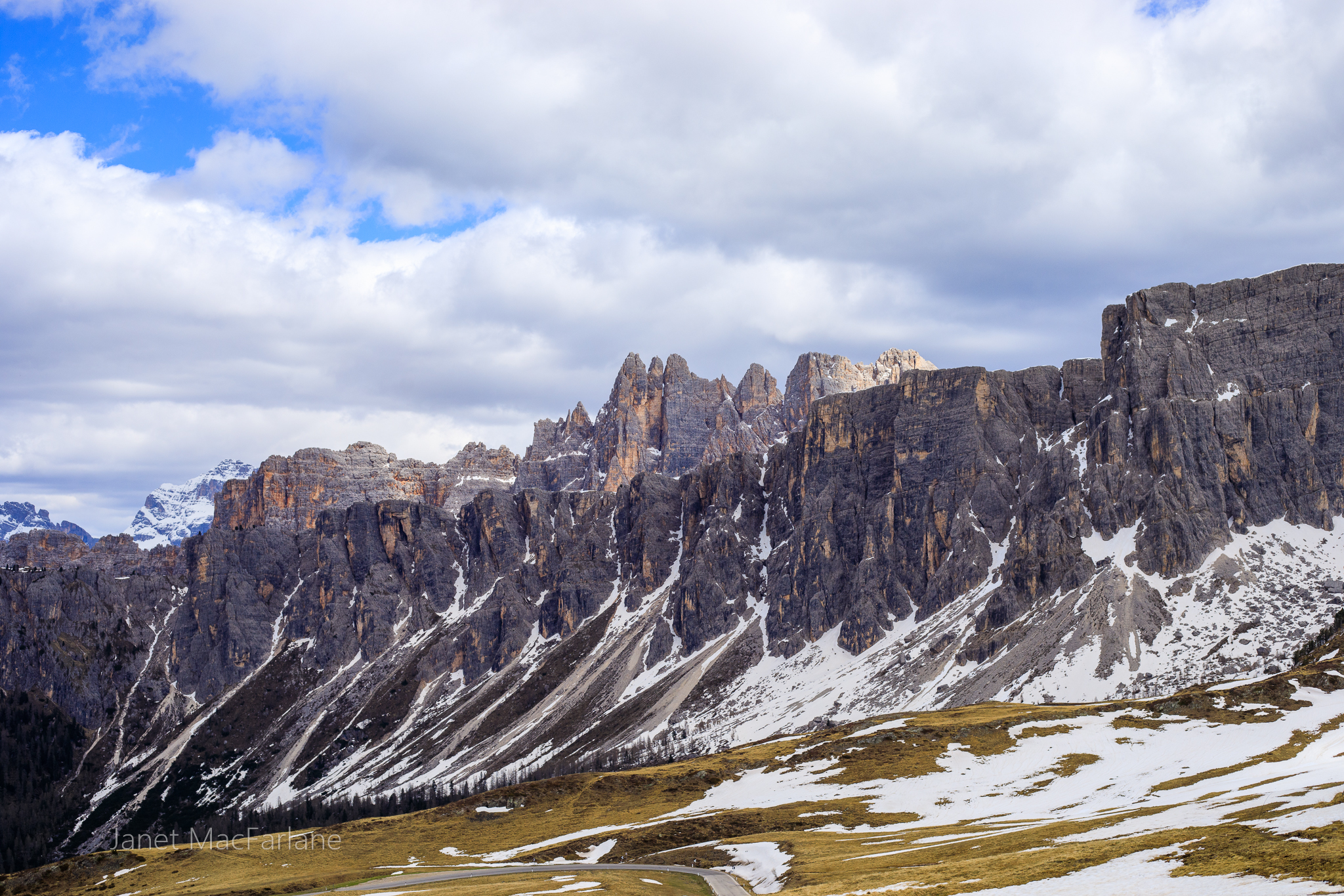 We boarded the bus again and travelled to another part of the mountains. We took a road winding up to the Passo Giau. The change in temperature was significant. It was cold and blustery. There was a little restaurant at our stop, but we had all packed lunches and ate them outside. After, we all went in for a hot beverage to warm ourselves before the next portion of the lesson.