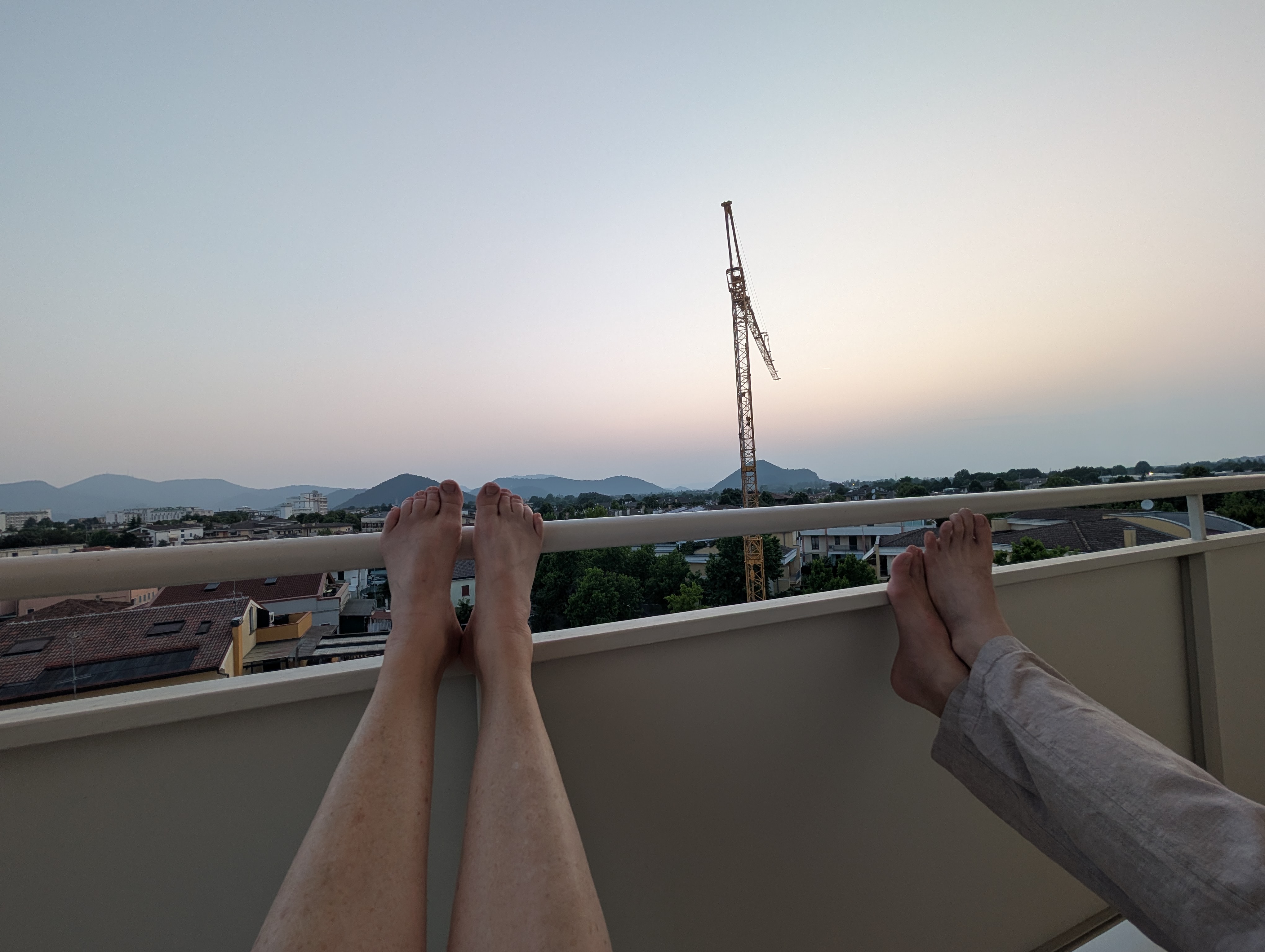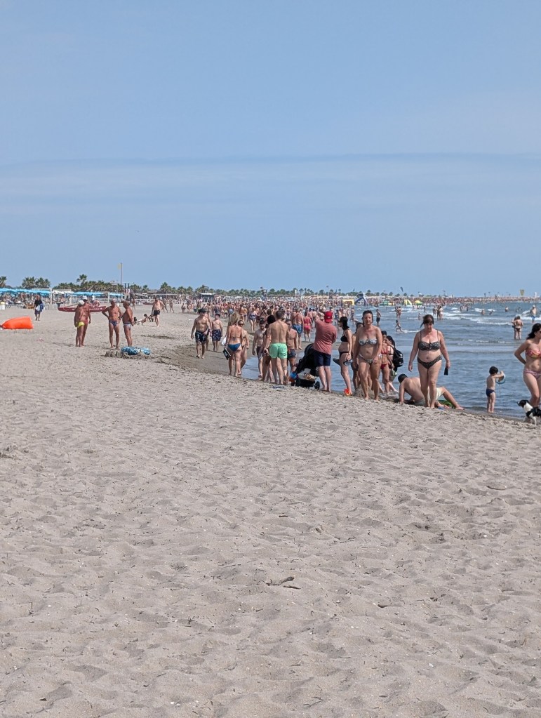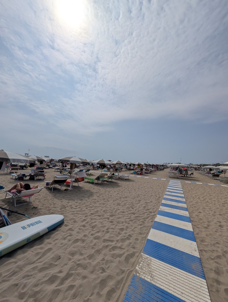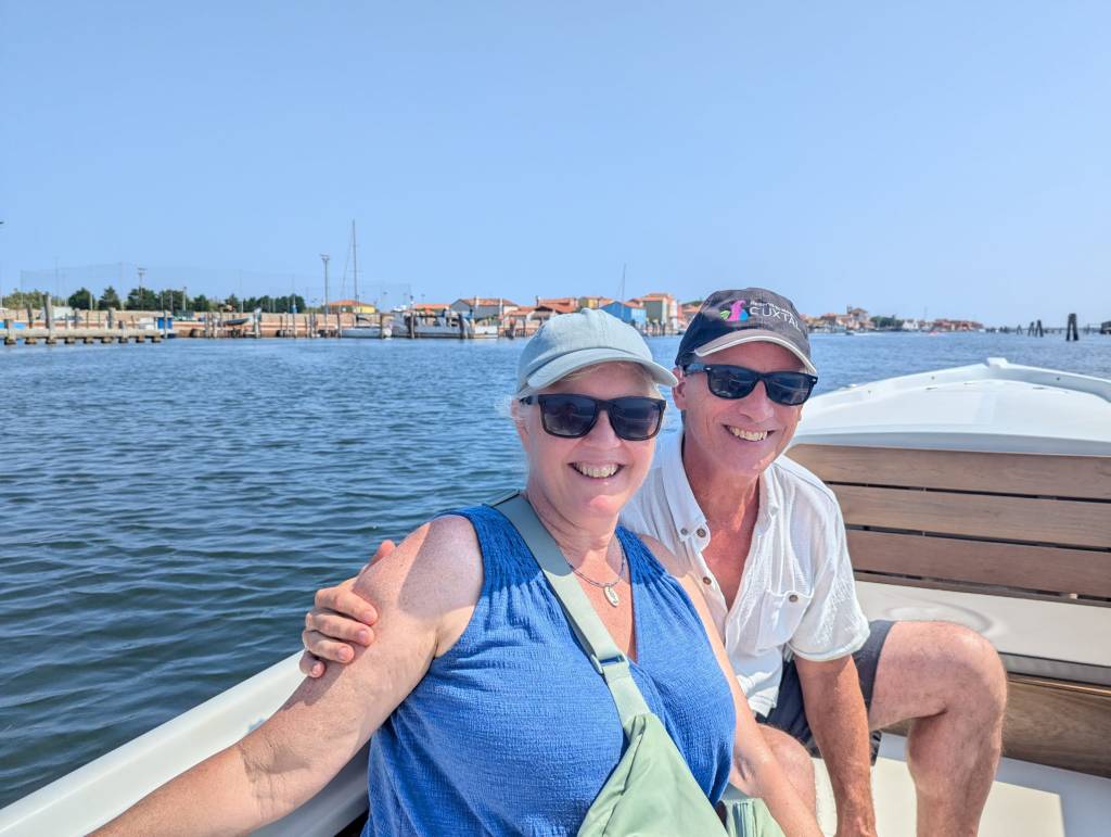 We were adventurous on Saturday and took a public bus to Sottomarina, the nearest seaside town on the Adriatric. We planned to take a boat ride, eat fresh seafood and do some sightseeing in the adjacent town of Chioggia. With our bus tickets in hand, (5 Euros one way) we got on a bus fully packed with lots of young people headed to the beach . It was standing room only. We squeezed ourselves in and held onto whatever we could. We sped down the roadway and lurched to a stop at each bus stop along the way; And somehow, miraculously, we squeezed more people on. At one stop, the bus police, who get on to check people’s tickets, couldn’t even get on. Instead, one of the officers made people get away from the front of the bus, packing us in more tightly, and half-heartedly told the driver he had too many people. We continued on. Someone smelled like onions. An older man thought his earphones were connected to his phone, but the loud music from the reels he was watching would blare out. It was a chatty crowd full of mostly good energy. Occasionally, someone would get off. Eventually, the guy who was sitting atop the carpeted hump above the wheel well got off. We took the opportunity! David slid all the way back to the window and I sat in front of him, between his outstretched legs. It was nice to sit down. The traffic got thicker. We crawled closer to our destination, and we were released from our sardine can. Sottomarina is so built up. The beachfront is lined with beach clubs and restaurants. You can pay to reserve an umbrella, cabana, etc. Hotels span the strip with bikes, motorscooters, and motorcycles traversing the roads almost in equal number to cars. There is an Aldi on the beach! We took a walk down to the water to get our feet wet in the Adriatic. So many people!