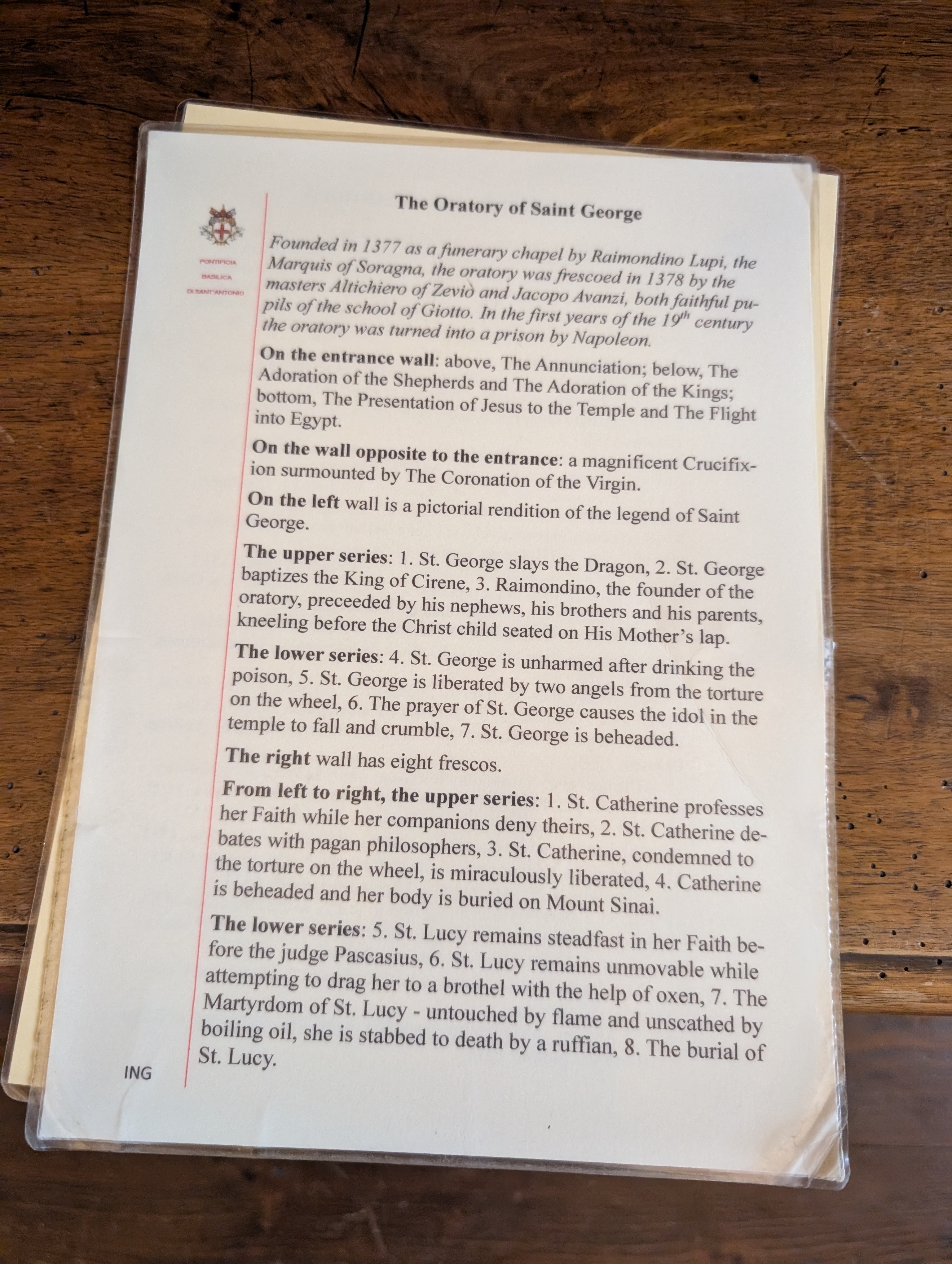 There is more to talk about and more to share. I know this post has gotten a little long. It is really hot out right now; so for the sake of staying cool inside, I am going to continue. Now, in case you think things are always grand and exciting living here, the mundane reality of life has a way of creeping in at every turn, like at this moment. We still have to do all the things of daily life, like food shopping, cooking, cleaning, doing laundry, etc. Sometimes, dare I say it, I feel bored. David has a job to do here and I kind of have to invent my day. I don’t have my people here. Most of the time, I do pretty well with finding things to do, but sometimes, it is a little difficult. Sometimes a bike ride or a spin around the roller skating track can cure the problem; Or writing a post and editing photos. Or I can wander into yet another UNESCO World Heritage Site and see amazing art, like at the Oratory of St. Georgio. It is a good problem to have.
